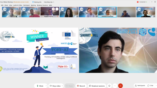 On the second part of the special session, the first SMART4ALL pitching event for selected funded projects was held as a contest among 5 PAEs (APIARY, EDIoT, FlexCLEC, RADIUS, TONI-AI) who made brief targeted presentations to be evaluated by a board of four evaluators: Mr. Nikitas Georgiadis, Sales Account manager at Cisco, Mr. Miguel Raposo entrepreneur and investor, Mr. Konstantinos Karvounakis,  Investment Associate at Metavallon.vc and Mr. Georgios Keramidas, Assistant professor in Computer Architecture, technical manager of SMART4ALL and CSO at Think Silicon S.A.. TONI-AI CTTE, represented by Marko Petkovic, data scientist at 5M ICT, gained the first place in the pitching and the award, a.k.a. a CCNA voucher offered by Cisco.