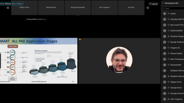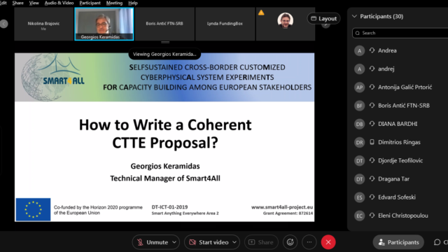 The program of the webinar included presentations by SMART4ALL partners to assist attendees with the procedure of preparing a proposal for a CTTE. In specific, Lynda O’Mahony, project & product manager at FundingBox, explained all the details of the 2nd Open Call on CTTE, Georgios Keramidas and Christos Antonopoulos, SMART4ALL technical managers, offered tips and advice on writing a cohesive, competitive proposal, highlighting things to avoid when preparing a SMART4ALL Open Call, based on real examples from previous calls.