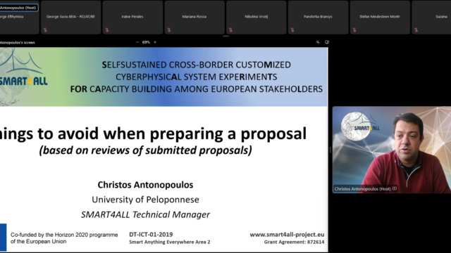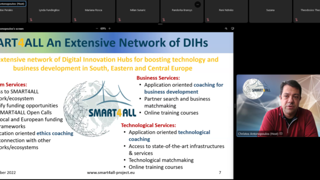 The event was attended by more than 20 persons, mainly researchers and SMEs’ representatives from SEE countries, involved in digital innovation activities. During the webinar, which was moderated by Zoran Mitrovic, Professor at the Faculty of Technical Sciences Novi Sad (FTN), participants were initially introduced to SMART4ALL basic principles and services by Christos Antonopoulos, Assistant Professor at the University of Peloponnese (UoP) and technical manager of SMART4ALL.