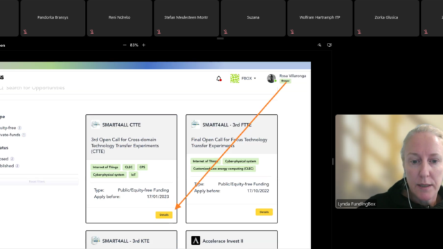 The program of the webinar included presentations by SMART4ALL partners to assist attendees with the procedure of preparing a proposal for a Cross-domain Technology Transfer Experiment. In specific, Antonio Montalvo and Lynda O’Mahony, senior project manager and project & product manager respectively at FundingBox, explained all the details of the 3rd Open Call on CTTE and presented the platform for submitting applications, while Florian Fricke, Head of SMART4ALL Mentoring Committee, offered advice on writing a cohesive, competitive proposal and Christos Antonopoulos highlighted things to avoid when preparing a proposal, based on reviews of submitted applications from previous calls.